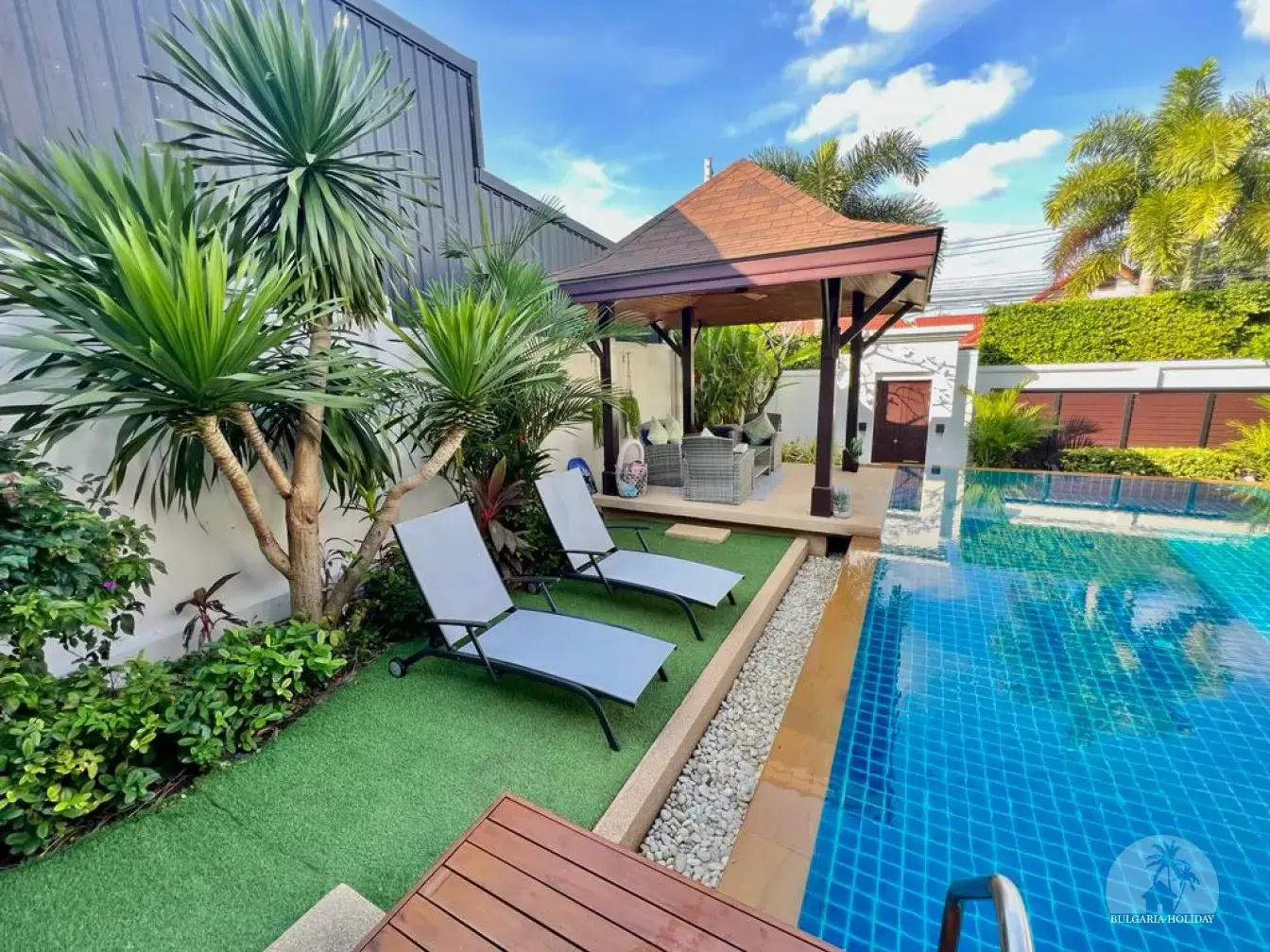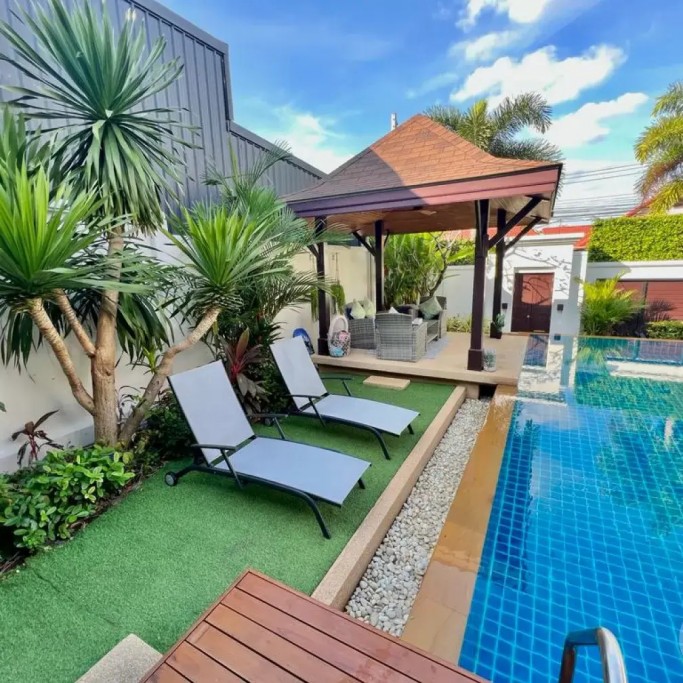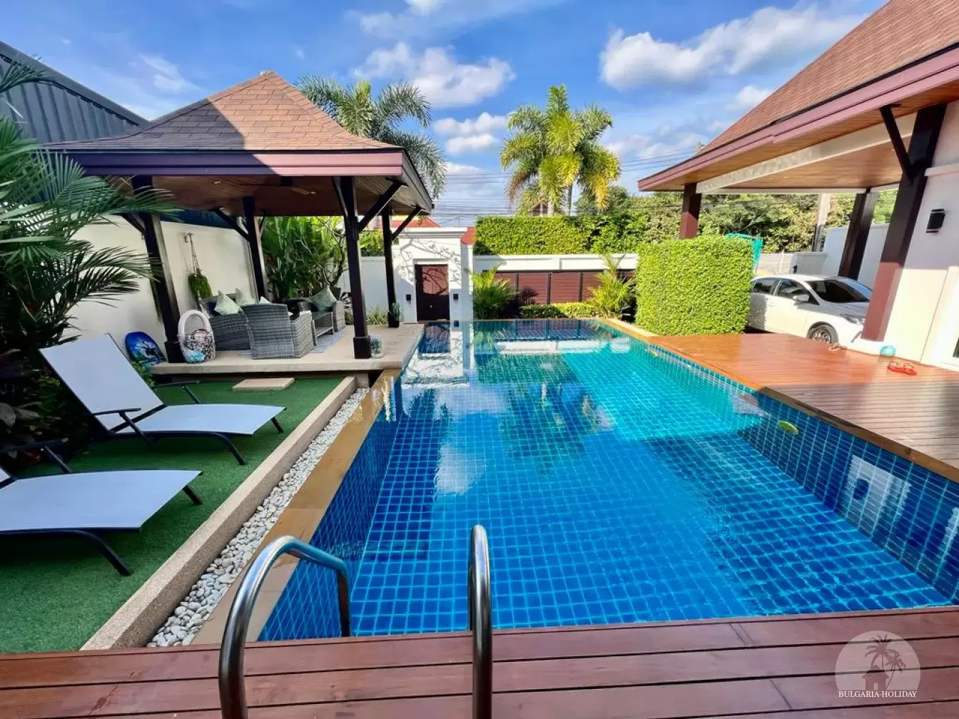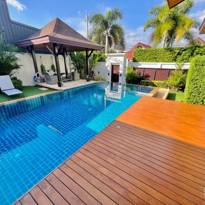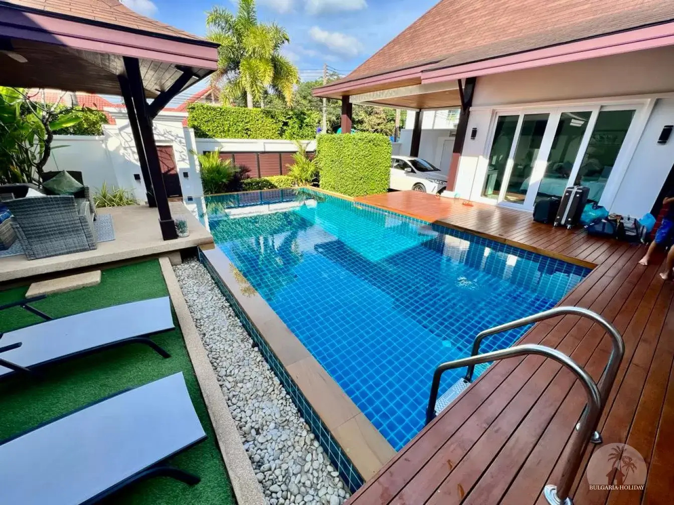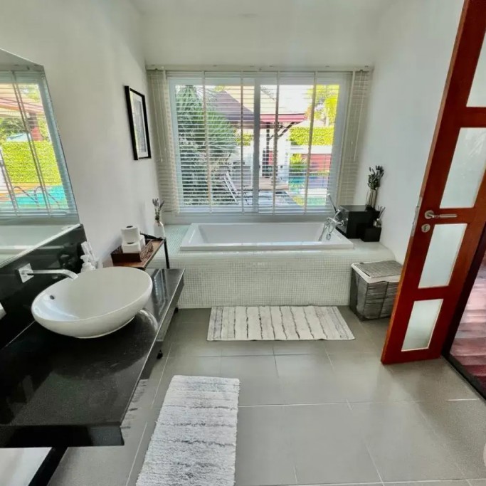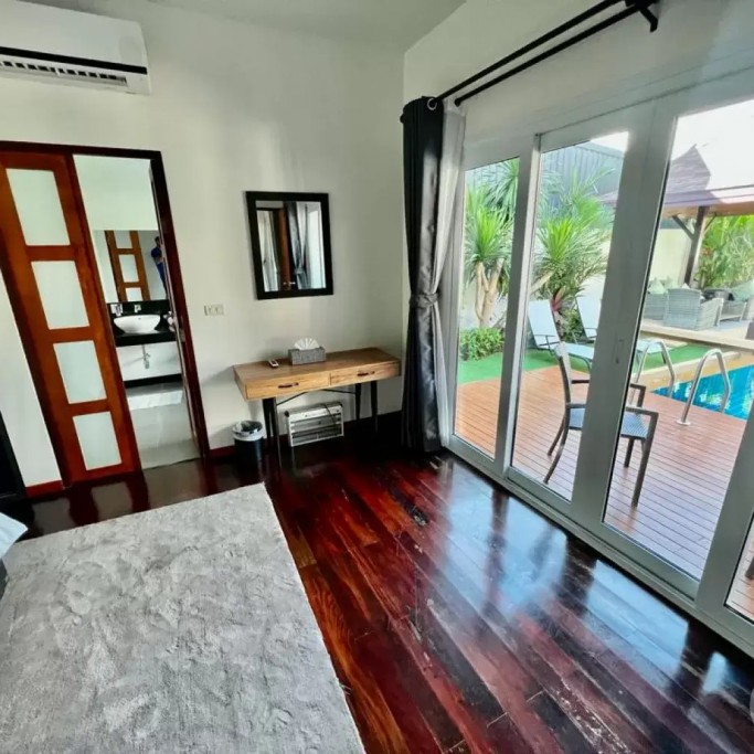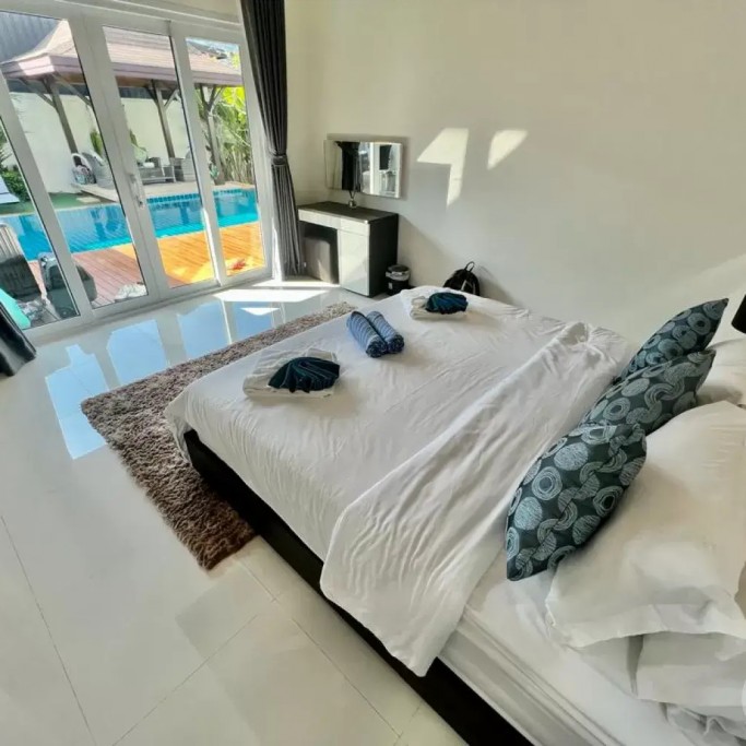 Outside, you can enjoy the beautiful tropical garden with outdoor lounge and barbecue. The pool is huge, 4 by 8 metres with automatic LED lighting at night for special scenery!