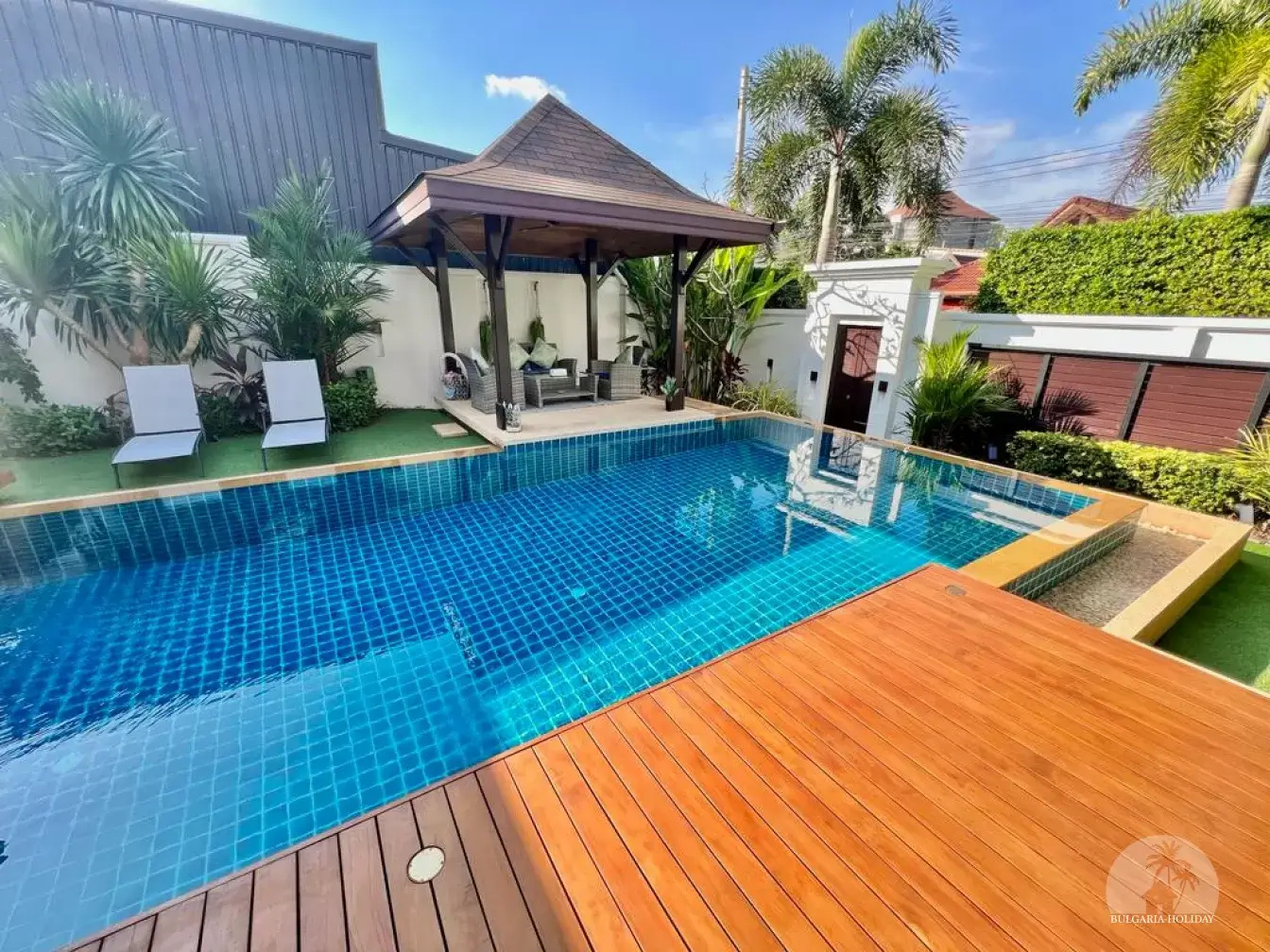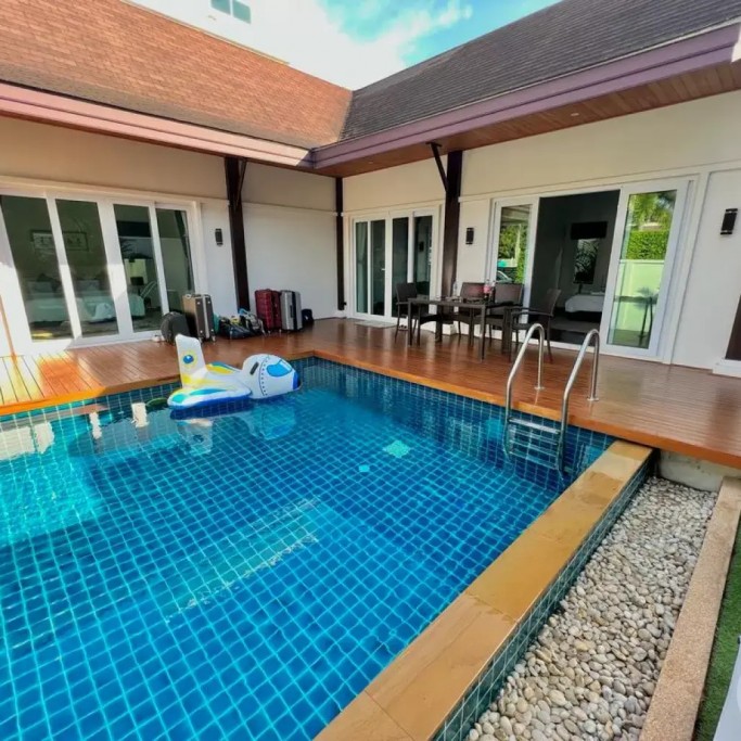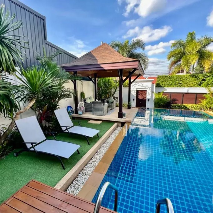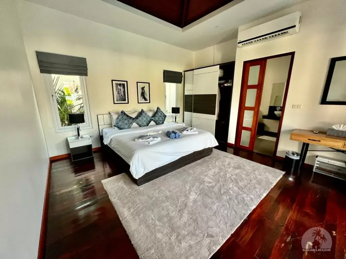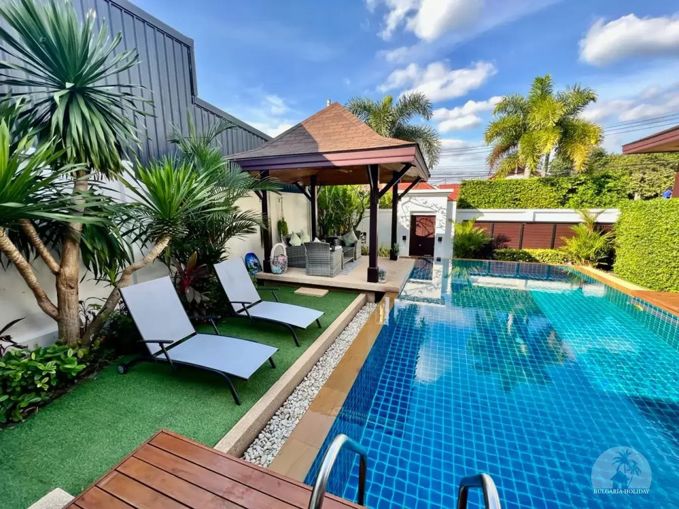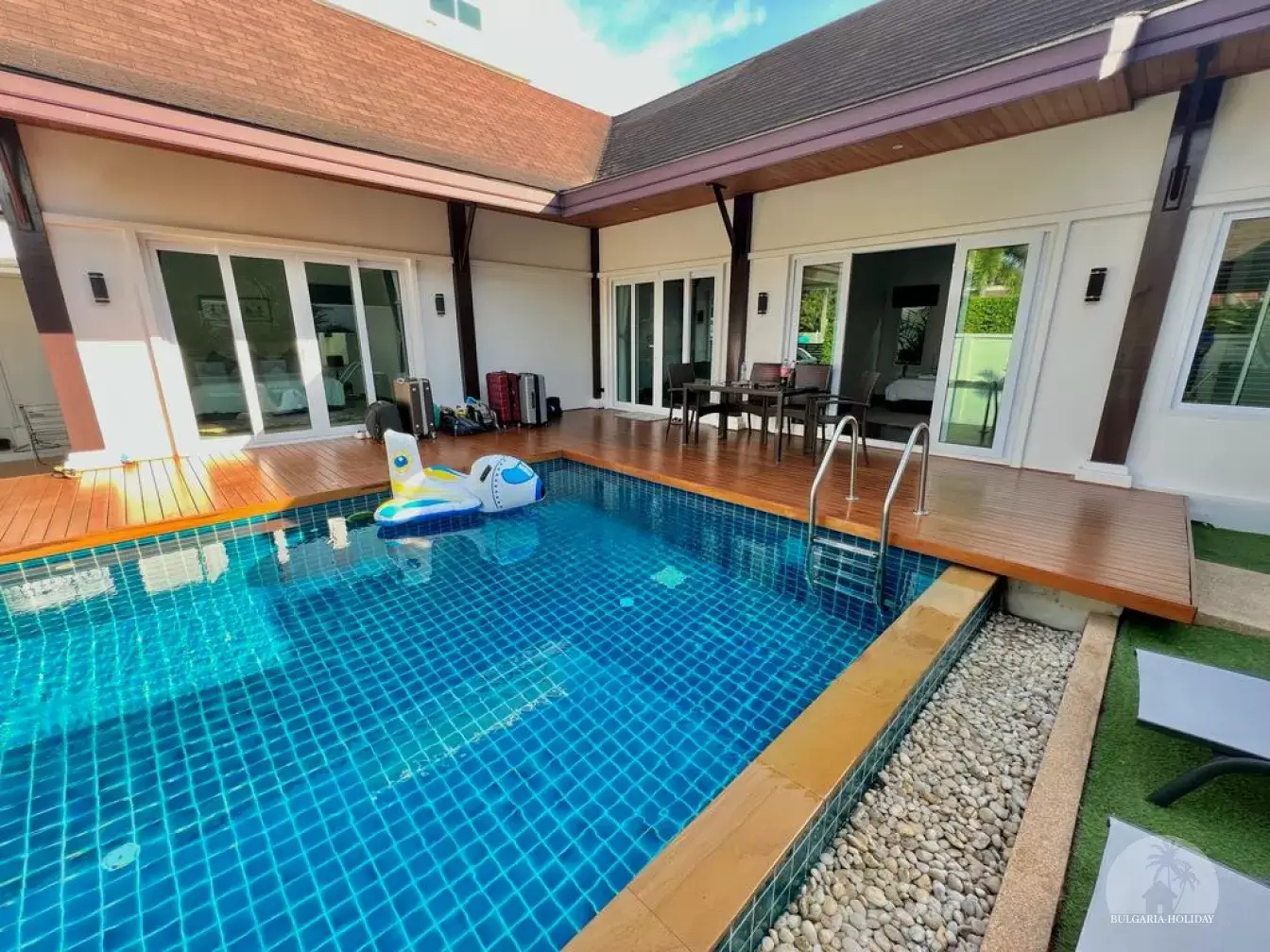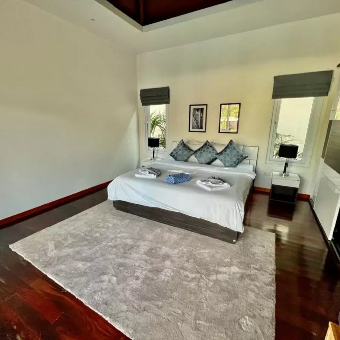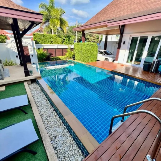 Outside, you can enjoy the beautiful tropical garden with outdoor lounge and barbecue. The pool is huge, 4 by 8 metres with automatic LED lighting at night for special scenery!